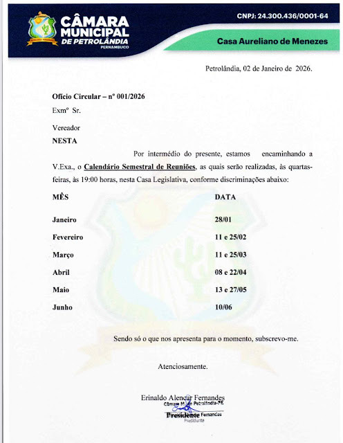 A Câmara Municipal de Petrolândia torna público o calendário oficial das Sessões Ordinárias referentes ao 1º semestre de 2026, reforçando seu compromisso com a transparência, a organização dos trabalhos legislativos e a participação da população nas decisões do Poder Legislativo.