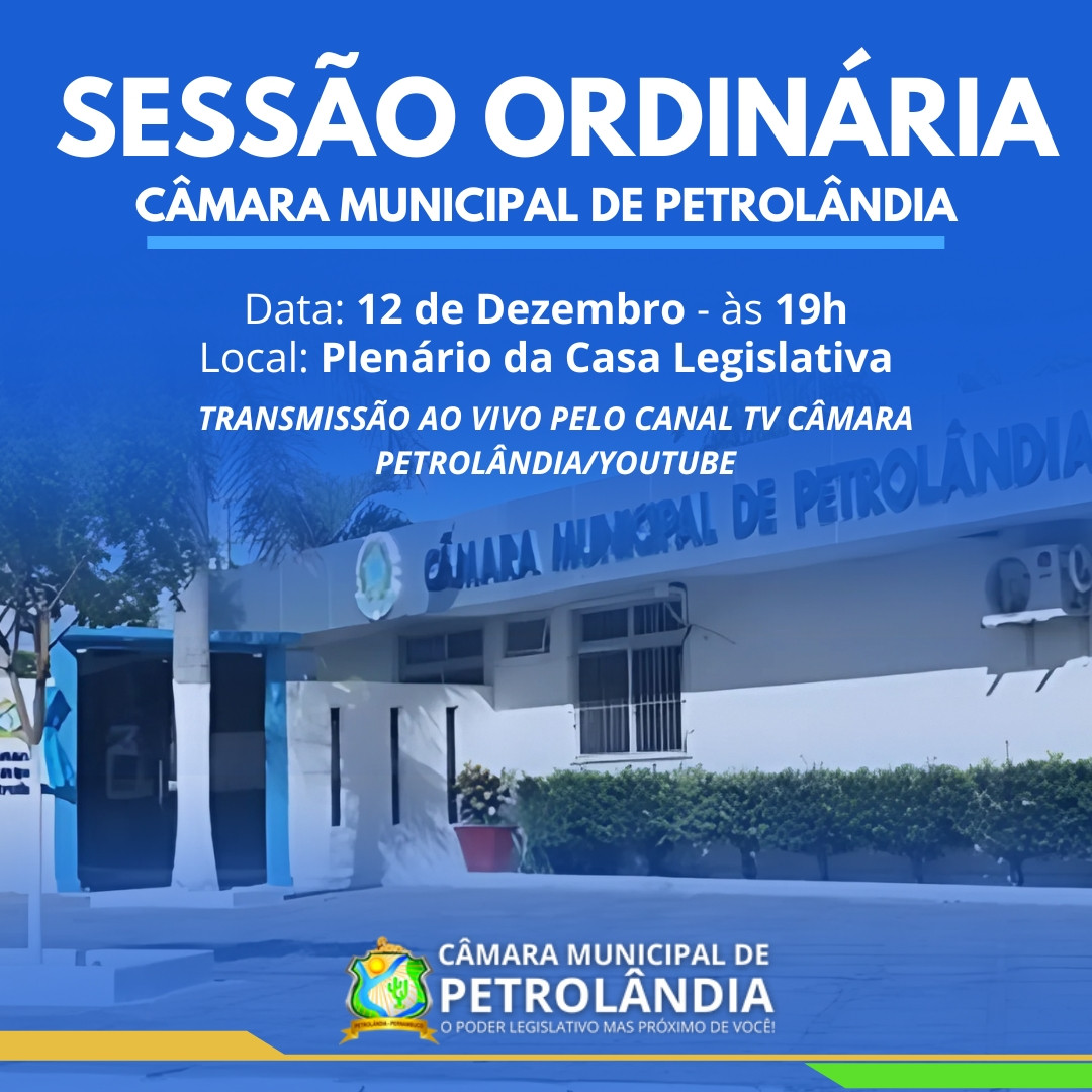 A Câmara Municipal de Petrolândia (PE) realiza na noite desta sexta-feira, dia 12 de dezembro de 2025, mais uma Sessão Ordinária, com início às 19h00.