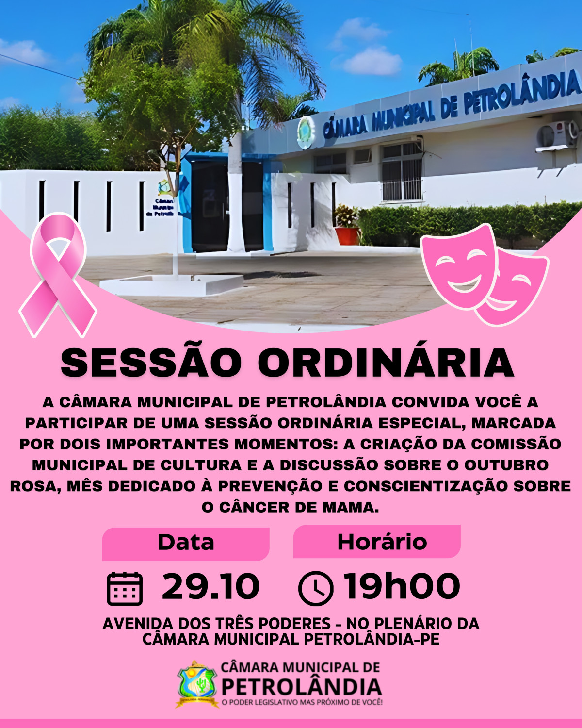 A Câmara Municipal de Petrolândia convida toda a população para participar de uma Sessão Ordinária Especial, que será marcada por dois momentos de grande relevância para o município: a criação da Comissão Municipal de Cultura e a discussão sobre o Outubro Rosa, mês dedicado à prevenção e conscientização sobre o Câncer de Mama.