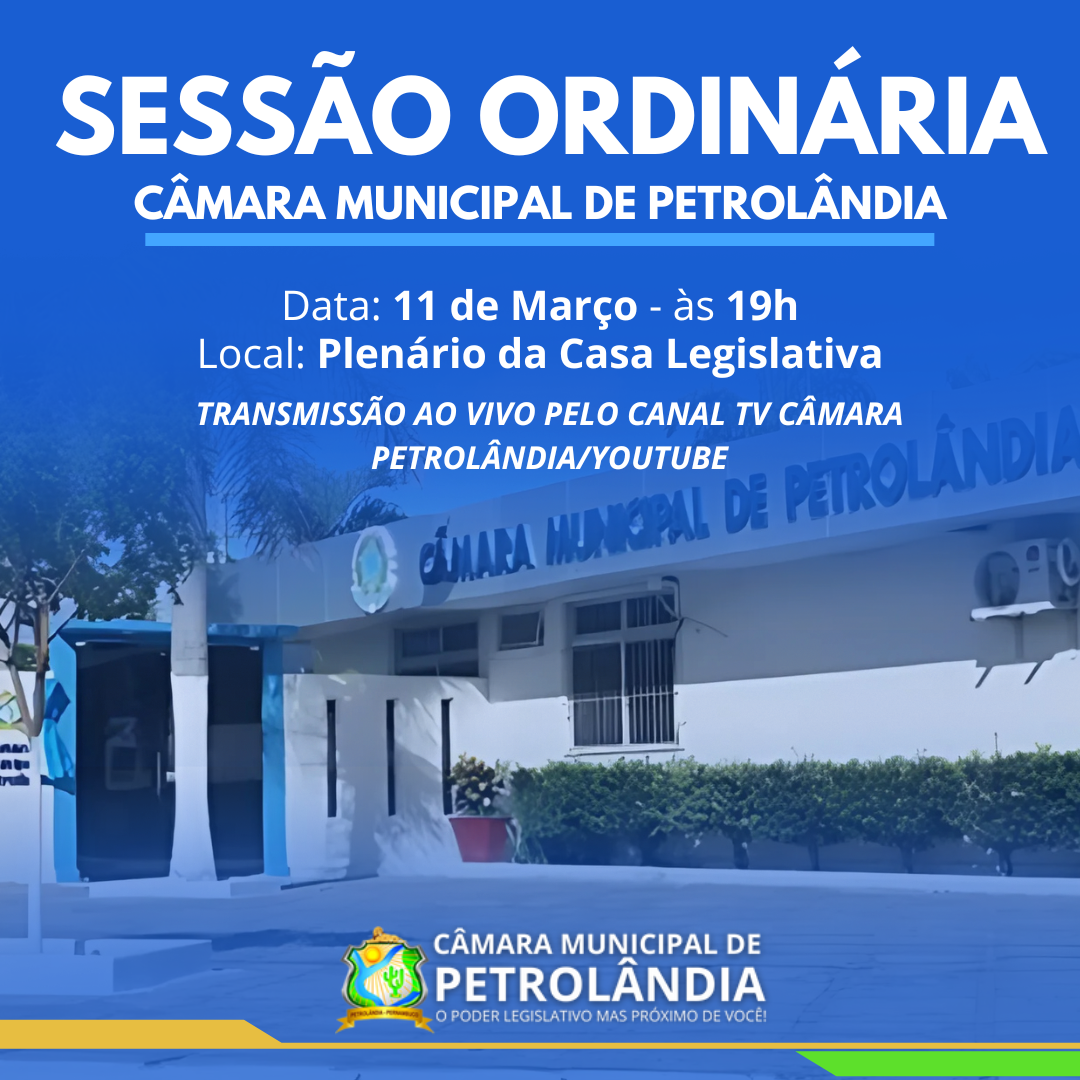 A Câmara Municipal de Petrolândia (PE) realiza na noite desta quarta-feira, dia 11 de março de 2026, mais uma Sessão Ordinária, com início às 19h00.